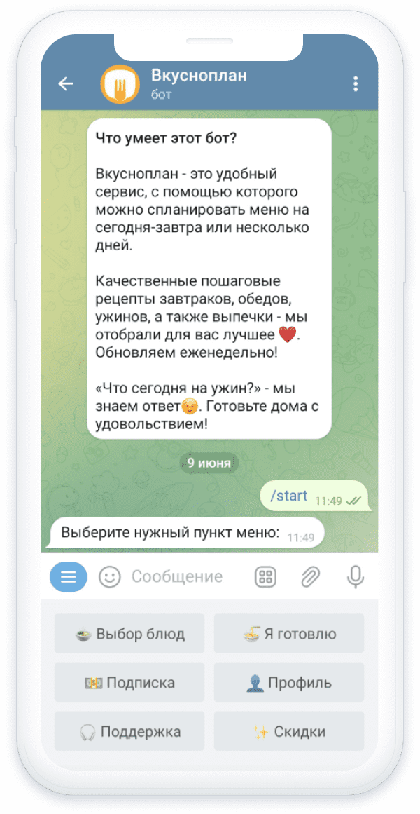 Именно так я и придумала Вкусноплан - мой бот с рецептами. Достаточно зайти в Telegram и выбрать понравившиеся блюда. Вуаля — освобождается куча времени и сил на себя, детей, мужа. Готовка уже не вгоняет в уныние, улучшаются отношения в семье и качество жизни!